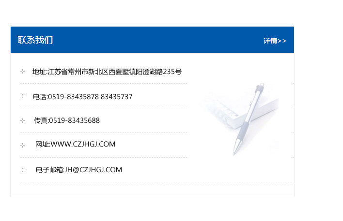 地址:常州市新北區友邦商務大廈1幢16、17層  電話:0519-85101652  傳真:0519-85112595  郵編:213022  網址:www.cz-jiayue_cn.h888y.com  郵箱:xiajifengaa@163.com